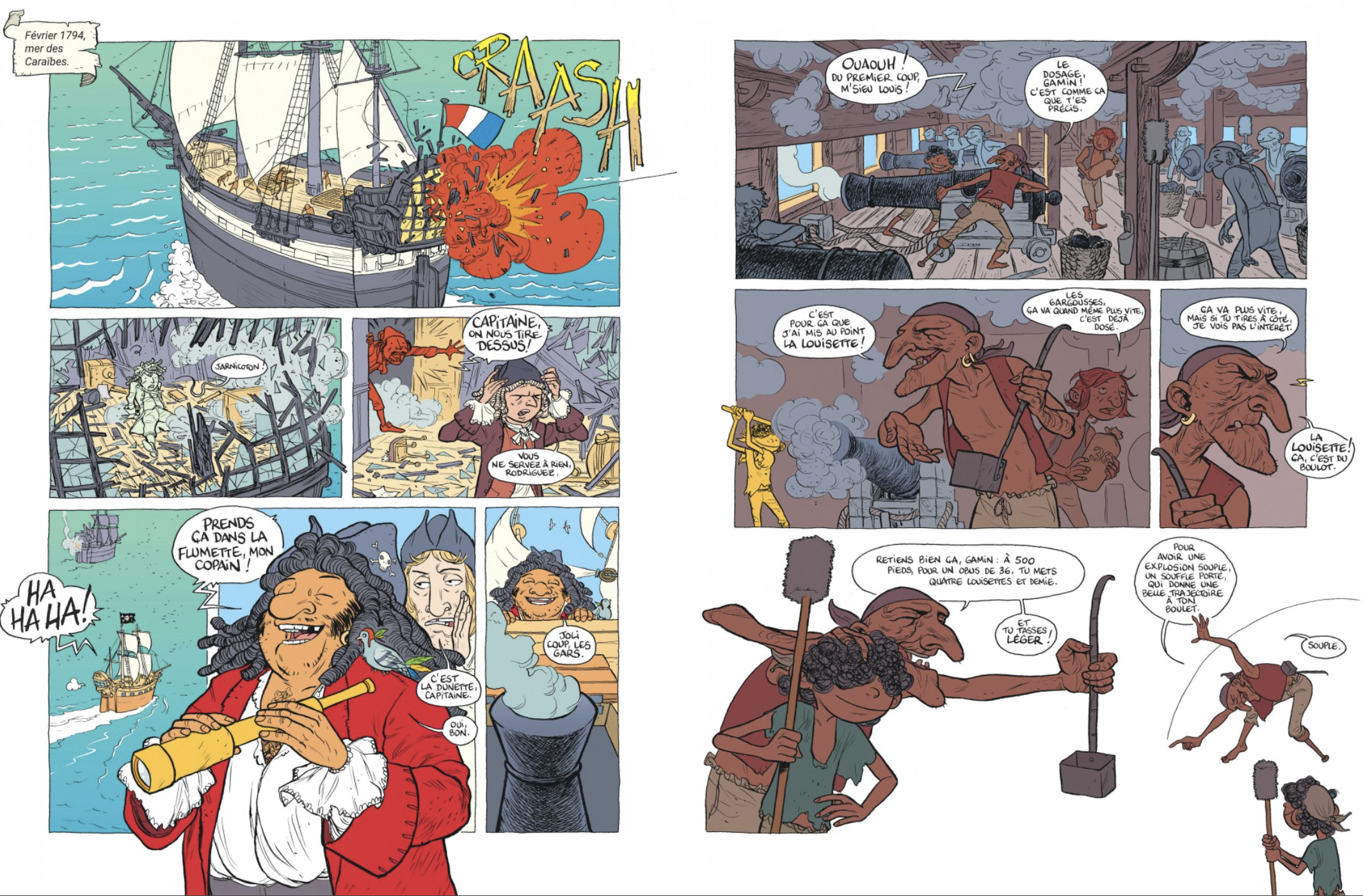 Réputé malchanceux toute sa vie, à cause de compagnons de voyage jaloux, il ne pourra d'abord pas publier tout le travail qu'il effectuera autour de la flore péruvienne. La Convention ( assemblée constituante élue au cours de la Révolution française) ensuite, le charge en 1794 d'aller présenter les étalons des nouveaux poids et mesures révolutionnaires aux États-Unis mais son navire, vers les Caraïbes, est attaqué par des pirates ! Les raisons de sa mort sont incertaines et Wilfrid Lupano s'est précipité dans ce gouffre d'incertitude pour imaginer les derniers mois de cet anti-héros. Dans cette élucubration historique, on croise des pirates complètement farfelus qui jouissent de trèves heureuses sur une île qu'ils surnomment Cocagna : l'un y compose des opéras en italien sans connaître un mot d'italien, un autre sort parfois de sa torpeur en-rhumée pour réclamer que la roue tourne et tous obtempèrent, une autre ne sort pas de son tonneau depuis la mort de sa mère, un autre encore est un pointilleux du dosage de la louisette... On rencontre également un prisonnier fort taciturne à force de manger des grenouilles au goût de poulet à toutes les sauces.