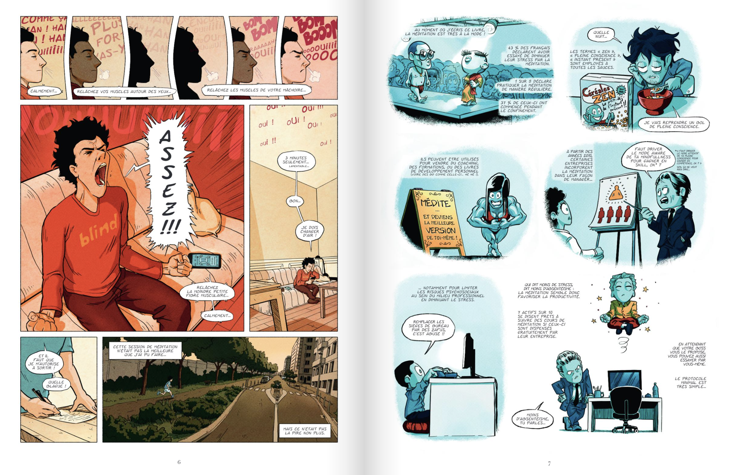 Il avait déjà tenté cette pratique auparavant, sur les conseils d'un dermatologue qui lui avait alors diagnostiqué un psoriasis et l'avait invité à faire diminuer le stress de son existence. On suit Arnaud Locquet dans son quotidien de célibataire que l'isolement forcé par le Covid mine, on cotoie ses parents, ses amis, ses collègues par téléphone interposé. L'auteur-narrateur manifeste sa nécessité d'évacuer un trop-plein qui bouillonne et partage avec le lecteur sa nouvelle plongée dans la méditation et ses hésitations, ses interrogations, ses explorations et ses expériences via des applications, des échanges avec d'autres méditants. Avec humour et intelligence, de manière très documentée, il confie tout ce qu'il en sait. Vous trouverez en fin d'album un peu de vocabulaire utile pour approfondir le tout si vous en ressentez le besoin.