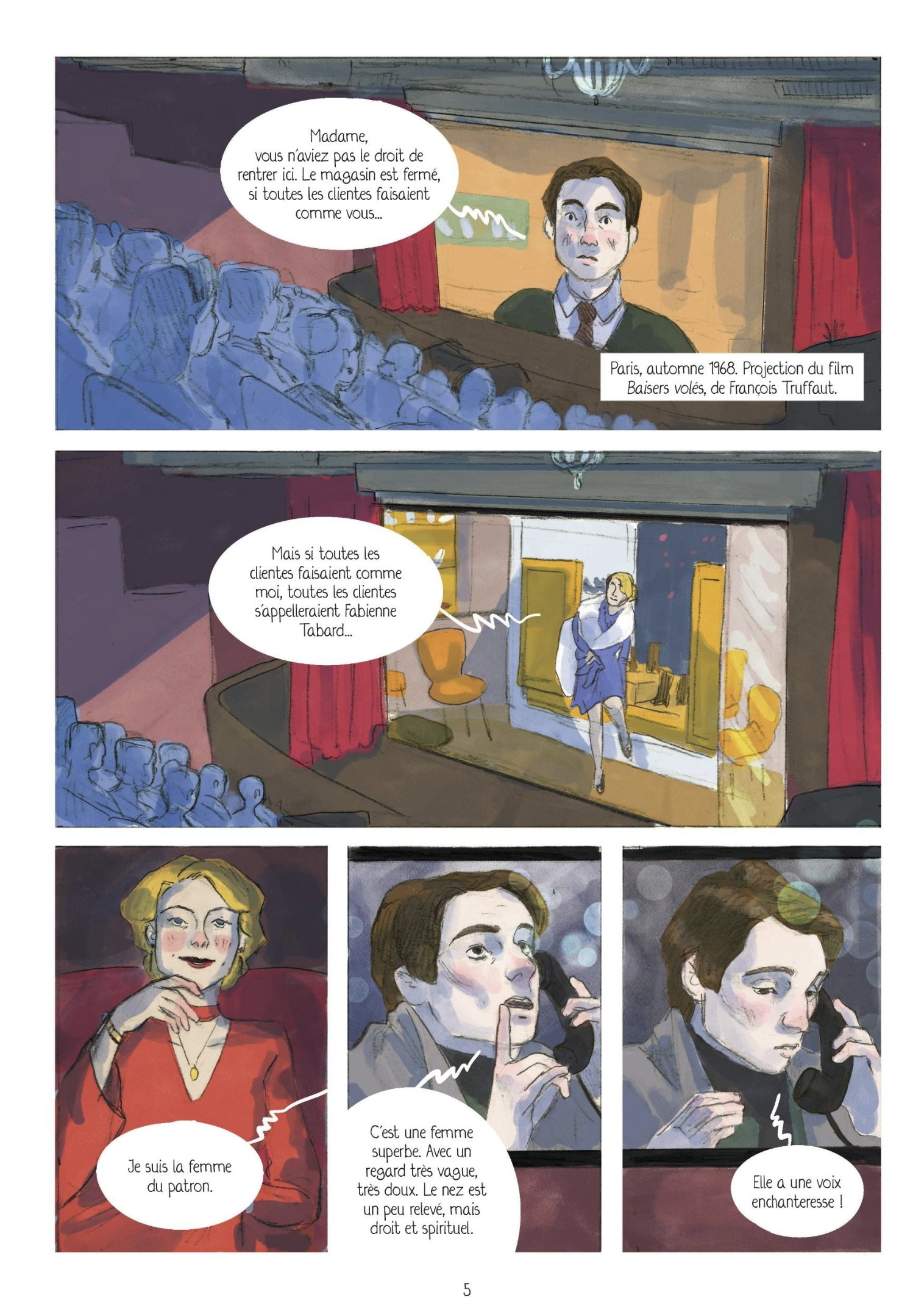 L’ouvrage commence en 1968, lors de la projection de Baisers volés, de François Truffaut, à Paris : « Ce n'est pas une femme. C'est une apparition »,entend-on dans le film. C’est aussi, et surtout, une voix, reconnaissable entre mille. Elle avait un son et une diction particulière, singulière, comme suspendue à sa respiration. C’est la seule chose qui manque à cette biographie en bande-dessinée, à la palette à la fois douce et flamboyante.