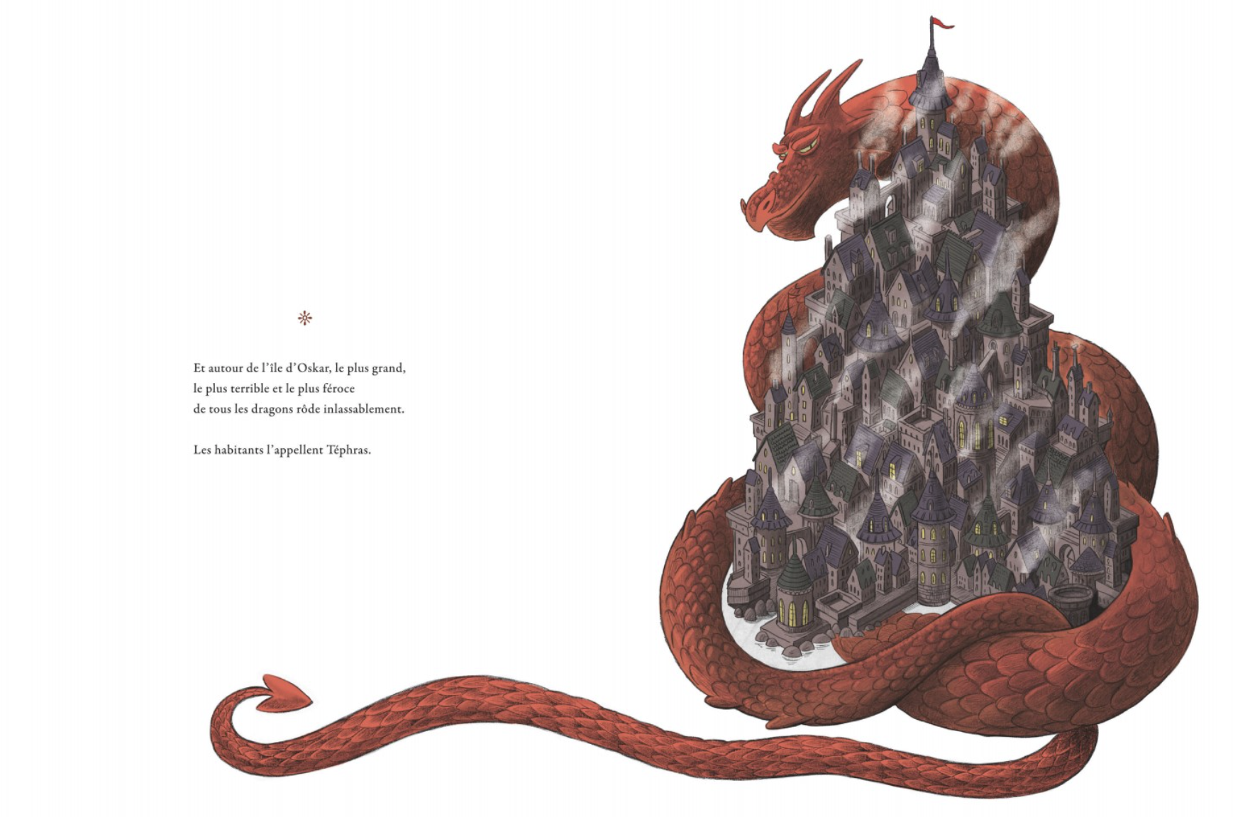 " Sur l'île d'Oskar, on raconte que les dragons sont méchants, que ce sont des géants d'écailles sans esprit, qui détruisent tout sur leur passage. On dit même qu'ils crachent des flammes si chaudes que le soleil s'éclipse face à leur fureur."