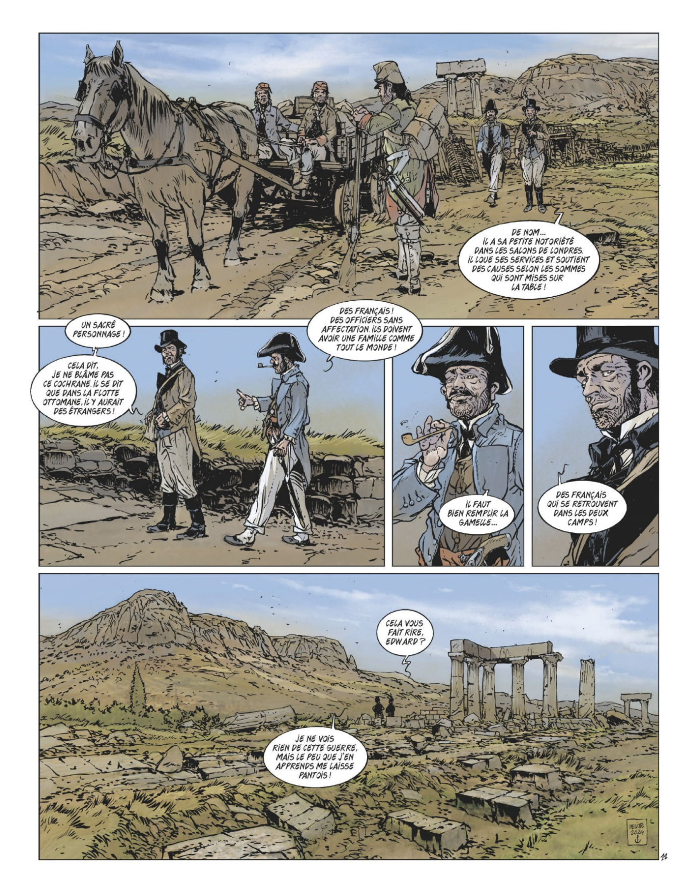 C’est à l’ouest du Péloponnèse que se situe la baie de Navarin : la bataille navale, entre une armada ottomane et une escadre franco-russe-britannique. Mais en l’absence de stratégie et de commandement commun, la bataille se déroule dans une confusion totale. Jean-Yves Delitte plonge le lecteur au cœur de ces combats atroces, dans d’incessants échanges de coups de canons et d’artillerie à faibles distances, dans un fatras de navires, de voiles, de mâts, de combattants massacrés, de marins agonisants et éventrés, de poudre de sang et de désolation. Avec maestria, force détails et réalisme, Jean-Yves Delitte signe un remarquable album, d’une intensité rare, d’une acuité sans égale. Un dossier très bien documenté clos l’ouvrage. Un excellent moment de lecture, à partager sans hésiter, une belle idée de cadeau pour les fêtes de fin d’année pour ceux et celles qui aiment prendre le large en compagnie de l'Histoire.